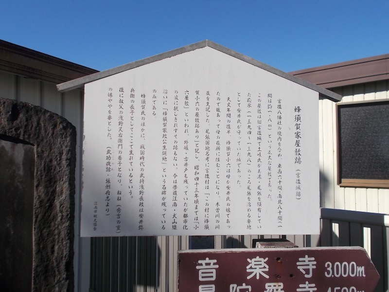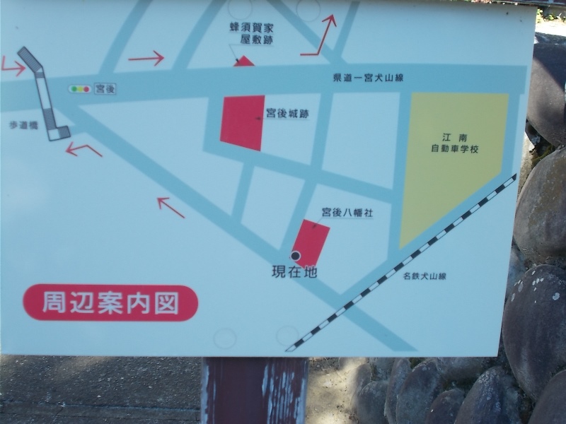 江南市街から県道64号線を東進し、古知野中学、宮後交差点を過ぎた辺りに蜂須賀屋敷の説明板が立つ。その南側一帯が城跡である。 |