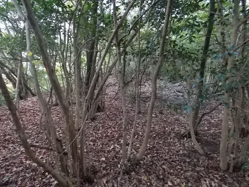 道から山を見ると北側に堀切が見えるのでこれを登る。 |