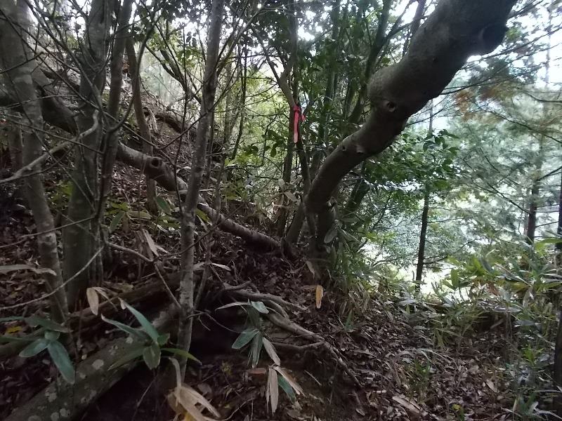 城跡としての標示はなかった。堀切にある目印のテープ。 |