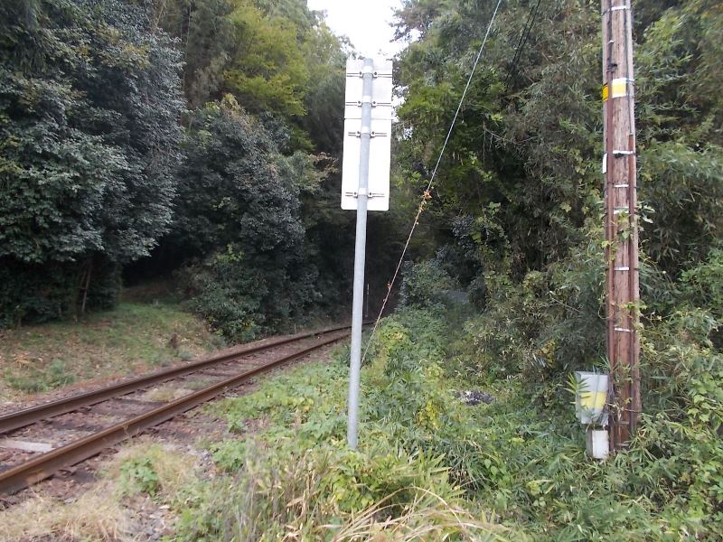 踏切脇に山に入る道があり、獣除けのトタン板を乗り越えて進む。 |