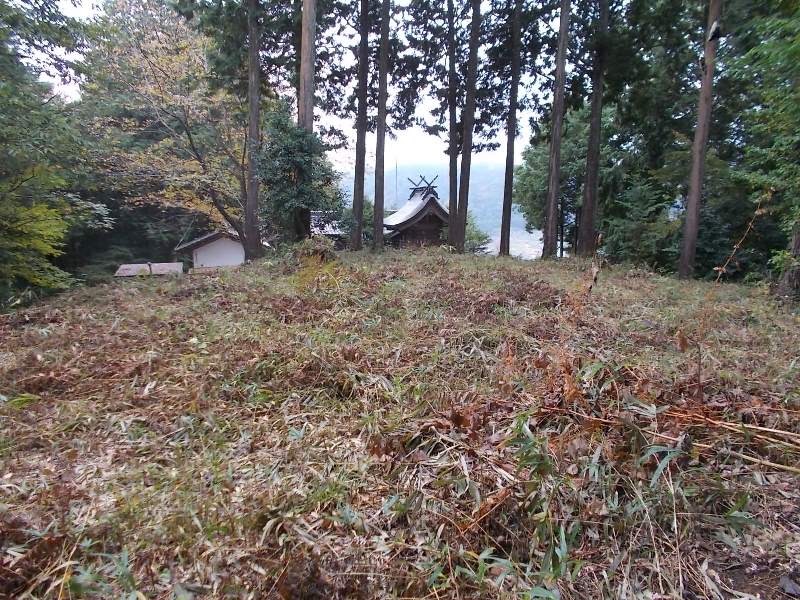 神社境内裏に主郭がある。その半分程度は植生に覆われている。 |