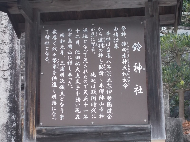 鈴神社の石段脇に神社の説明があり、城についても言及されている。 |