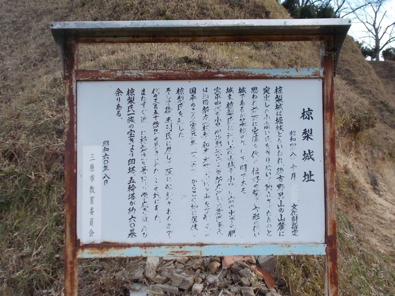 小早川氏の分家の椋梨氏の城で、毛利氏が慶長5年(1600)に所領を削減されたことに伴い椋梨氏も移封して城は廃された。 |