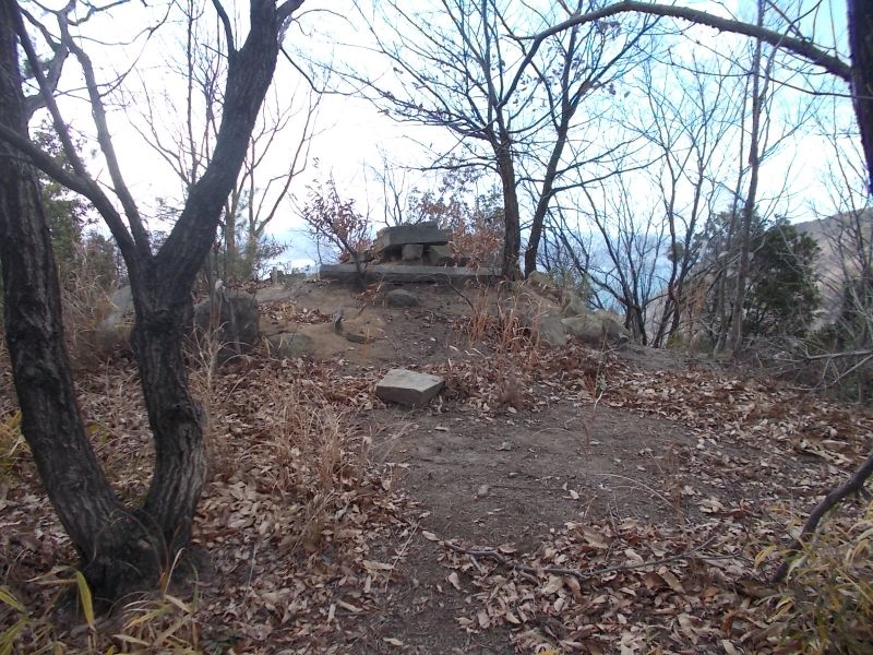 鳴滝山への自動車道の途中にある駐車場から少し南に進んで登山道に入り、300m程度で城跡である。 |