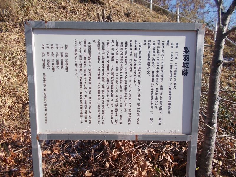 小早川氏の分家梨羽氏の城である。戦国期を通じて存続したが、毛利氏が慶長5年(1600)に所領を削減されたことに伴い梨羽氏も長門に移動して城は廃された。 |