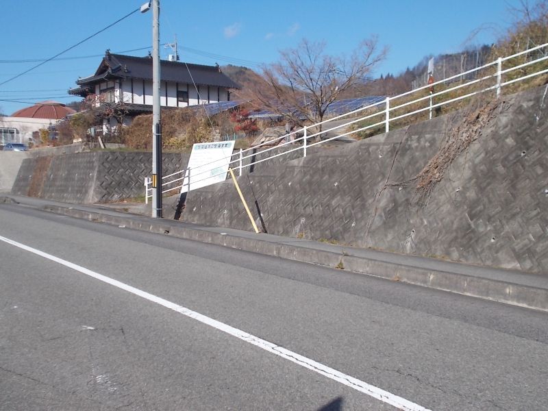 県道沿いに城関係の看板が立ち、そこから斜面を登っていく。 |