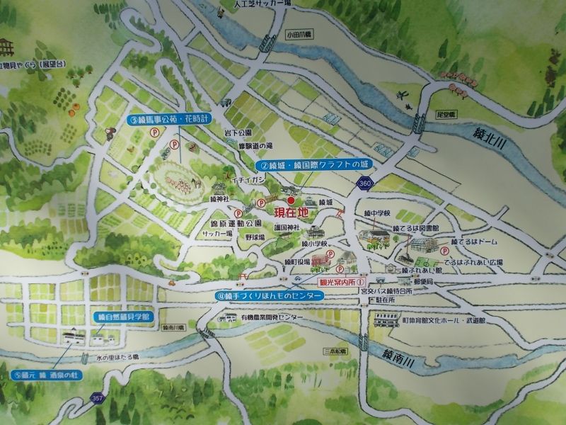 綾町の観光案内図。駐車場は整備されている。