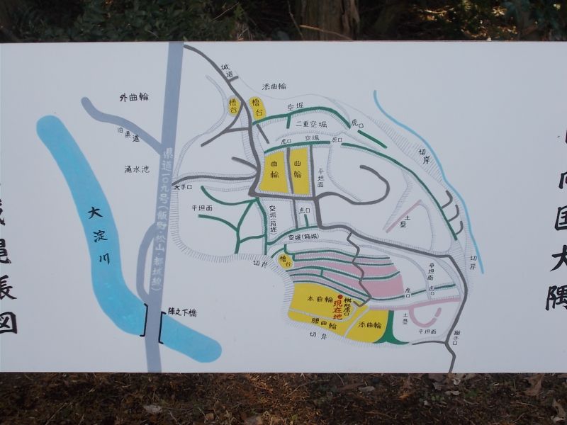 本曲輪にある案内図。その南には四重の堀切がある。 |