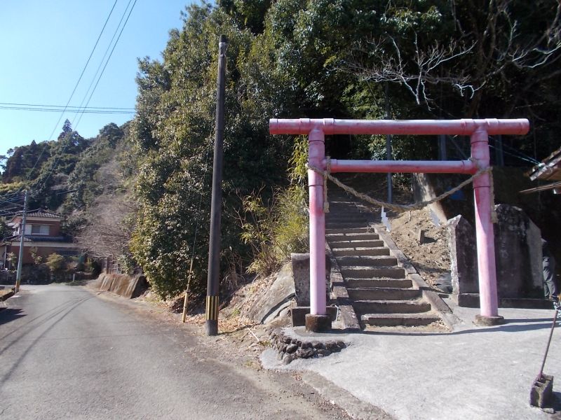酒谷神社の鳥居。鳥居の手前に説明板があり、石段を登って神社境内となった8曲輪に入る。比高50m程度である。 |