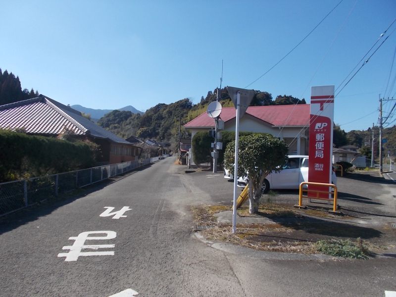 国道222号線沿いに酒谷郵便局がある。写真正面の道を神社方向に向かう。 |